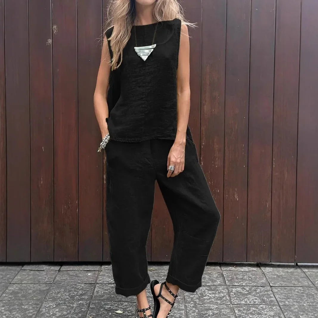 Un top sin mangas y pantalón fluido que caen con gracia, sin apretar ni marcar. Favorece, estiliza y te da libertad de movimiento.